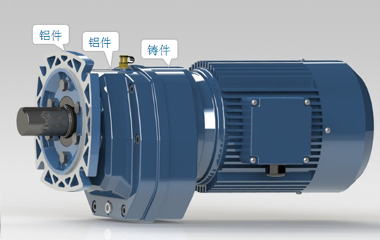 (1)、輕量化設計 本款減速機首次采用鋁件(法蘭與箱體)與鑄件(端蓋)相結合的設計理念(如圖1),在保證強度的情況下,大化的減輕整機重量,使整機重量降至21KG(以接0.75KW電機為例)。同時端蓋采用鑄件材料能有效的揮發(fā)出高速級所產(chǎn)生的熱量,促使整機溫度平衡。
